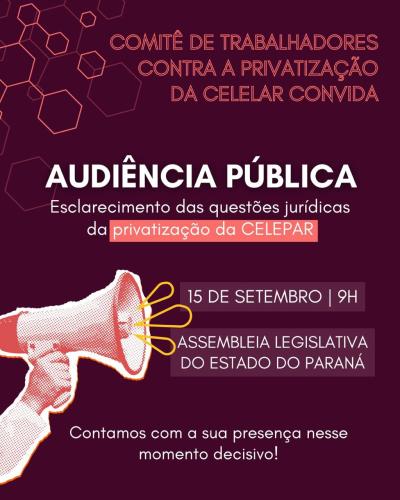 O SINDPD-PR convida todos(as) os(as) trabalhadores(as) de Tecnologia da Informação para participar da Audiência Pública que será realizada no dia 15 de setembro de 2025, com o objetivo de debater os impactos da possível privatização da CELEPAR.