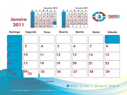 A Diretoria do SINDPD-PR em reunião realizada hoje (12/01/) definiu o calendário da Campanha Salarial 2011, na definição a diretoria conta com a participação da Comissão de Empregados e RA”s nas reuniões da pré- pauta . De acordo com a programação, a preparação da pré-pauta começará em 18/01/2011 e a entrega da Pauta de Reivindicações ocorrerá em 23 de fevereiro de 2011.